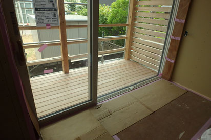 床までのスライディング窓に面してウッドデッキを施工しました。上部はテラス屋根があるので小雨程度なら濡れにくいようになっています。